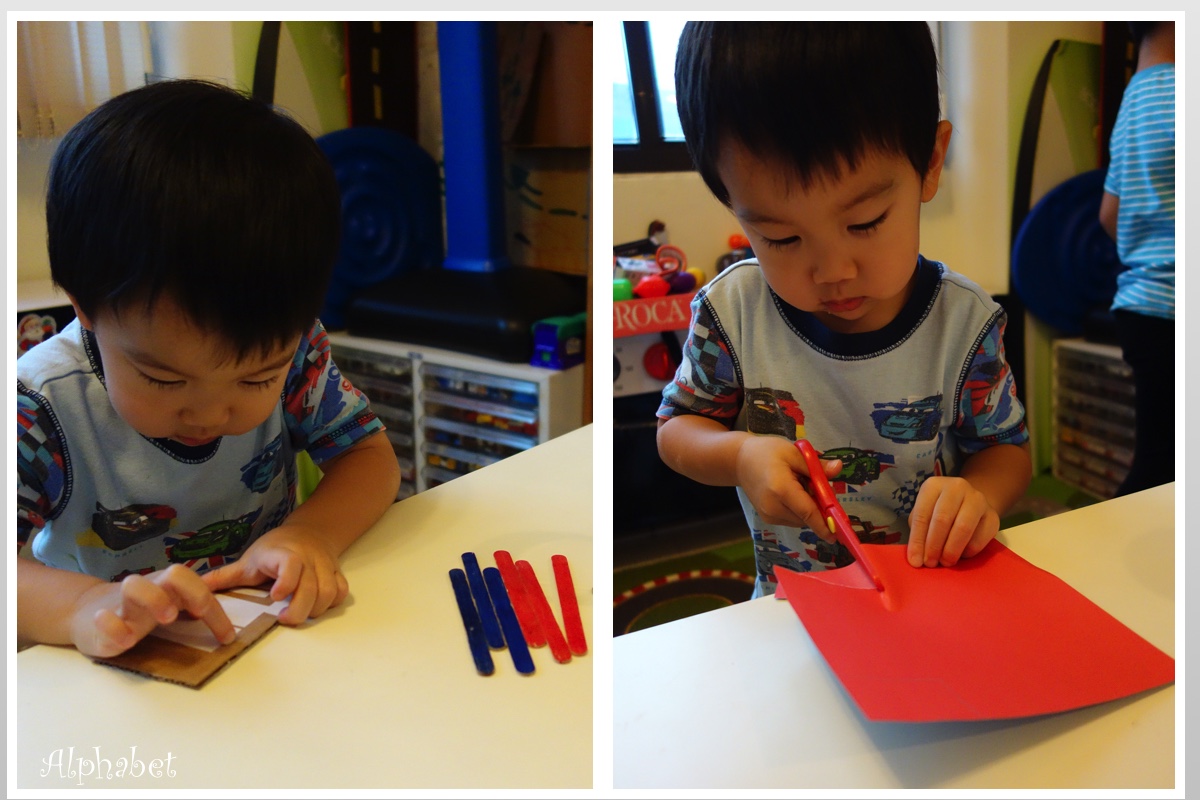 台灣國旗部分我是用色紙,我稍微畫了直線請他們剪裁,沒想到三歲的弟弟剪刀真的用得很好,他剪出來的直線很直耶,想當初Brendan剛開始的時候根本拿剪刀的角度不對,只都剪不下去,也是挫折了好一段時間,弟弟這方面的發展就很超前。
